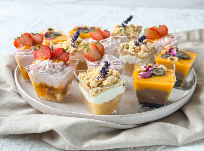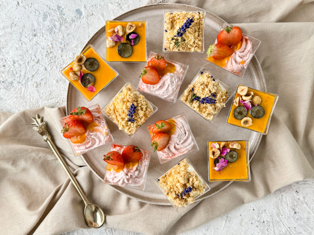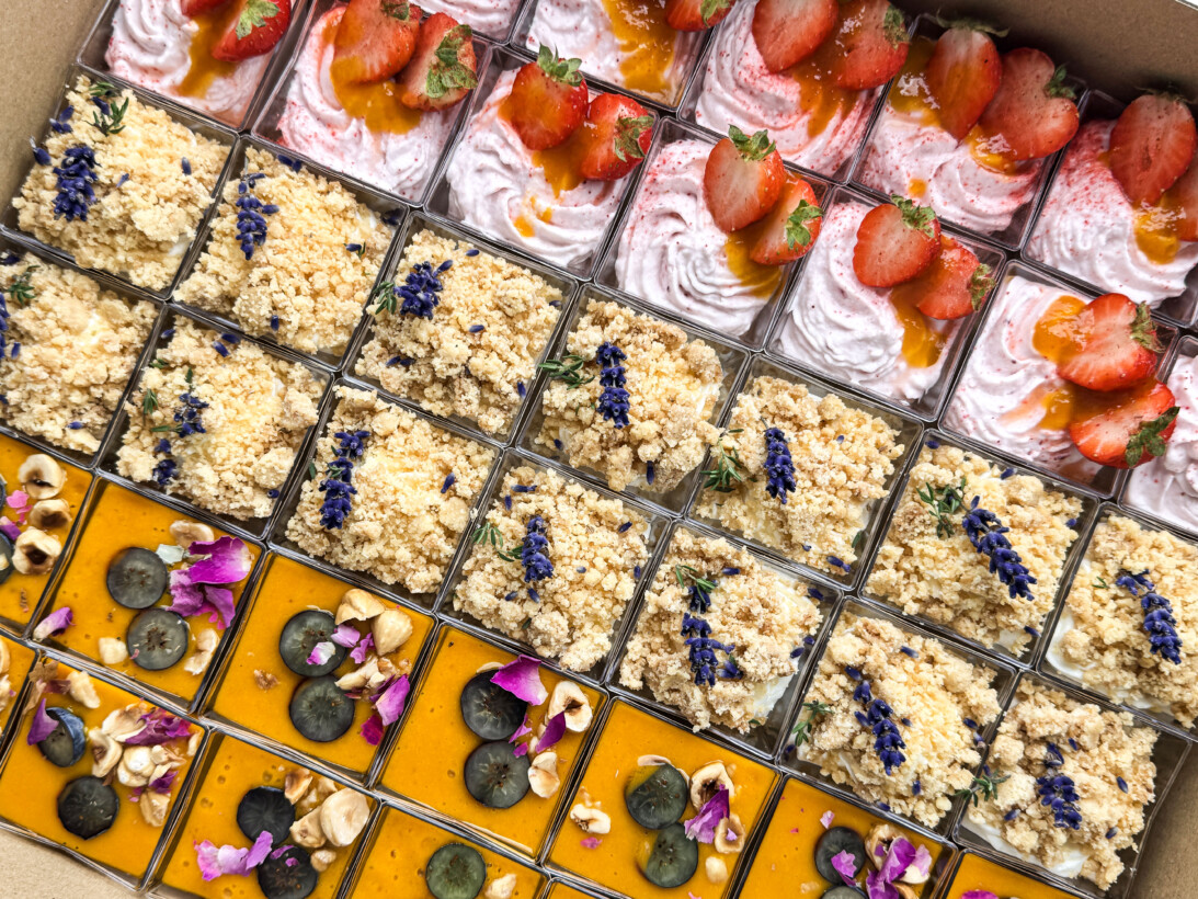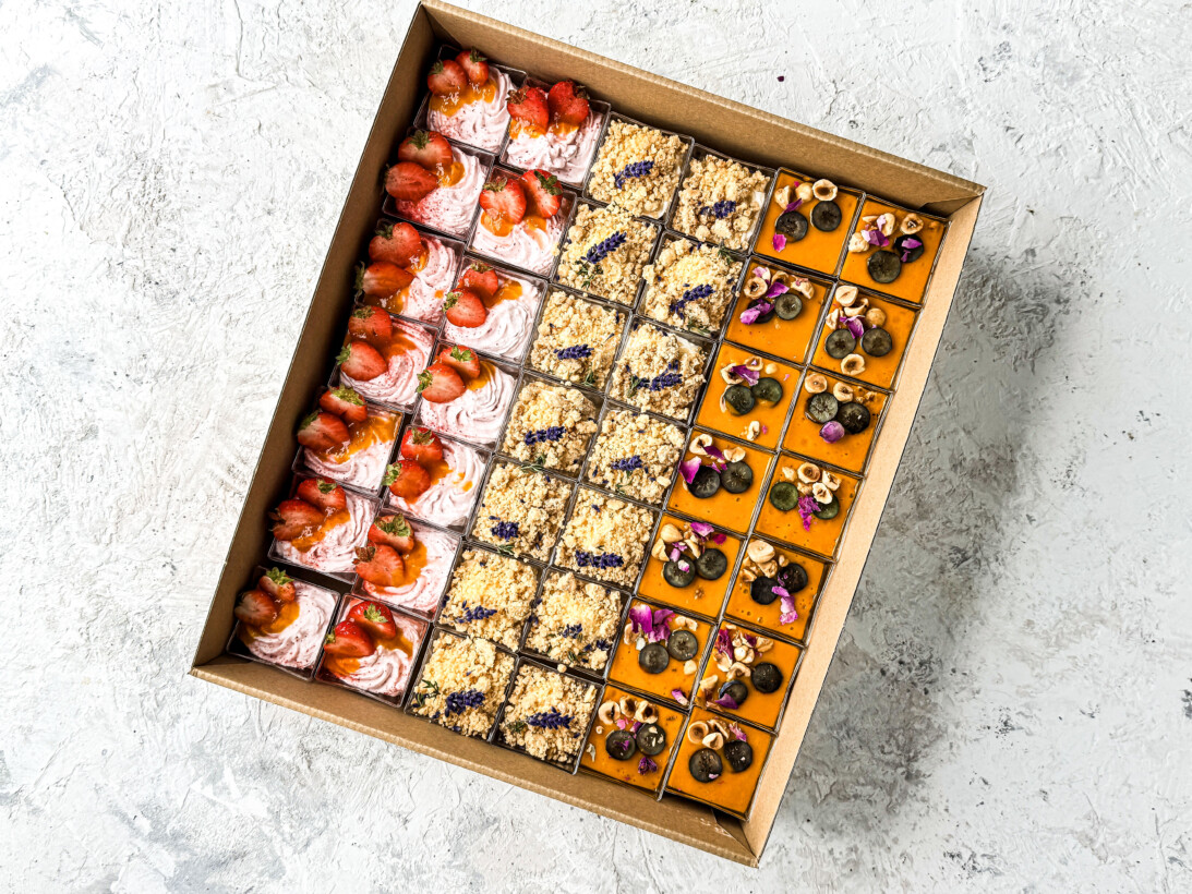 Słodki box z bezą z daktylami, lawendową panną cottą i musem z białej czekolady z liściem laurowym.