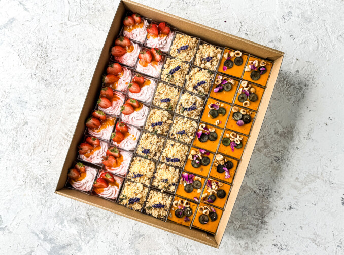 Słodki box z karpatką, pistacjowym sernikiem i kokosowo cytrynową tapioką.