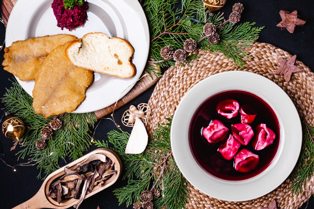 Box pełen tradycyjnych, wigilijnych potraw. Barszcz z uszkami, polskie pierogi, kapusta z grochem, kutia, karp, czy smaczne cista.