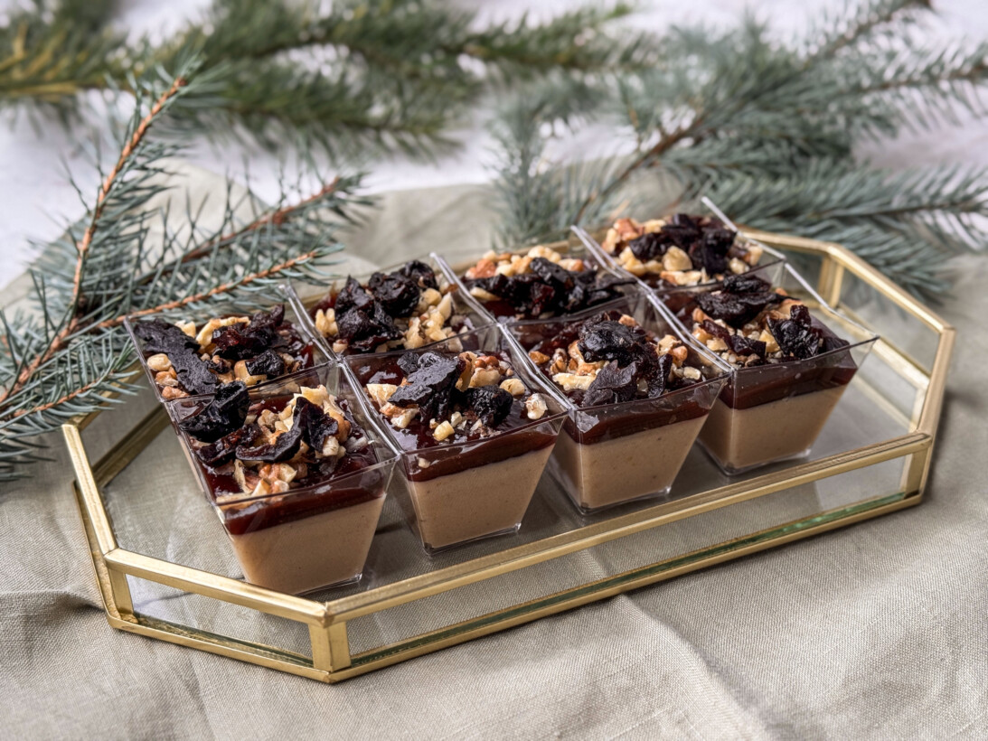 Krem piernikowy z białą czekoladą, pieczone śliwki, orzechy włoskie