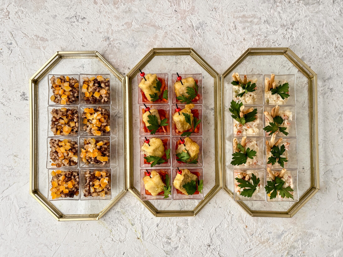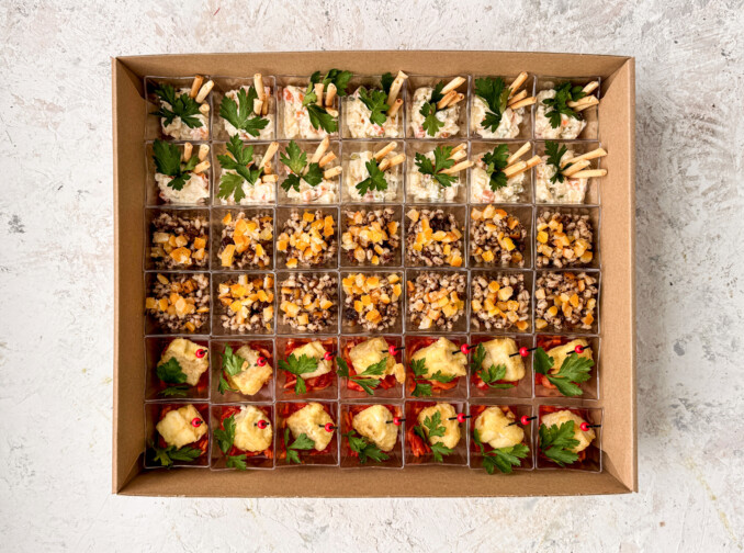 Swiąteczny box pełen słodkości. Mini torcik makowy, mini sernik z korzennymi herbatnikami i kremem ciasteczkowym oraz krem piernikowy z białą czekoladą.