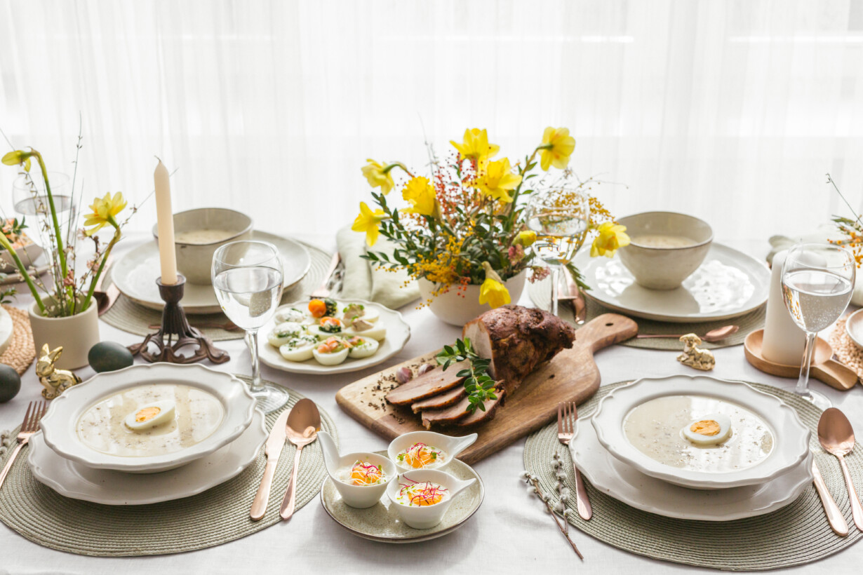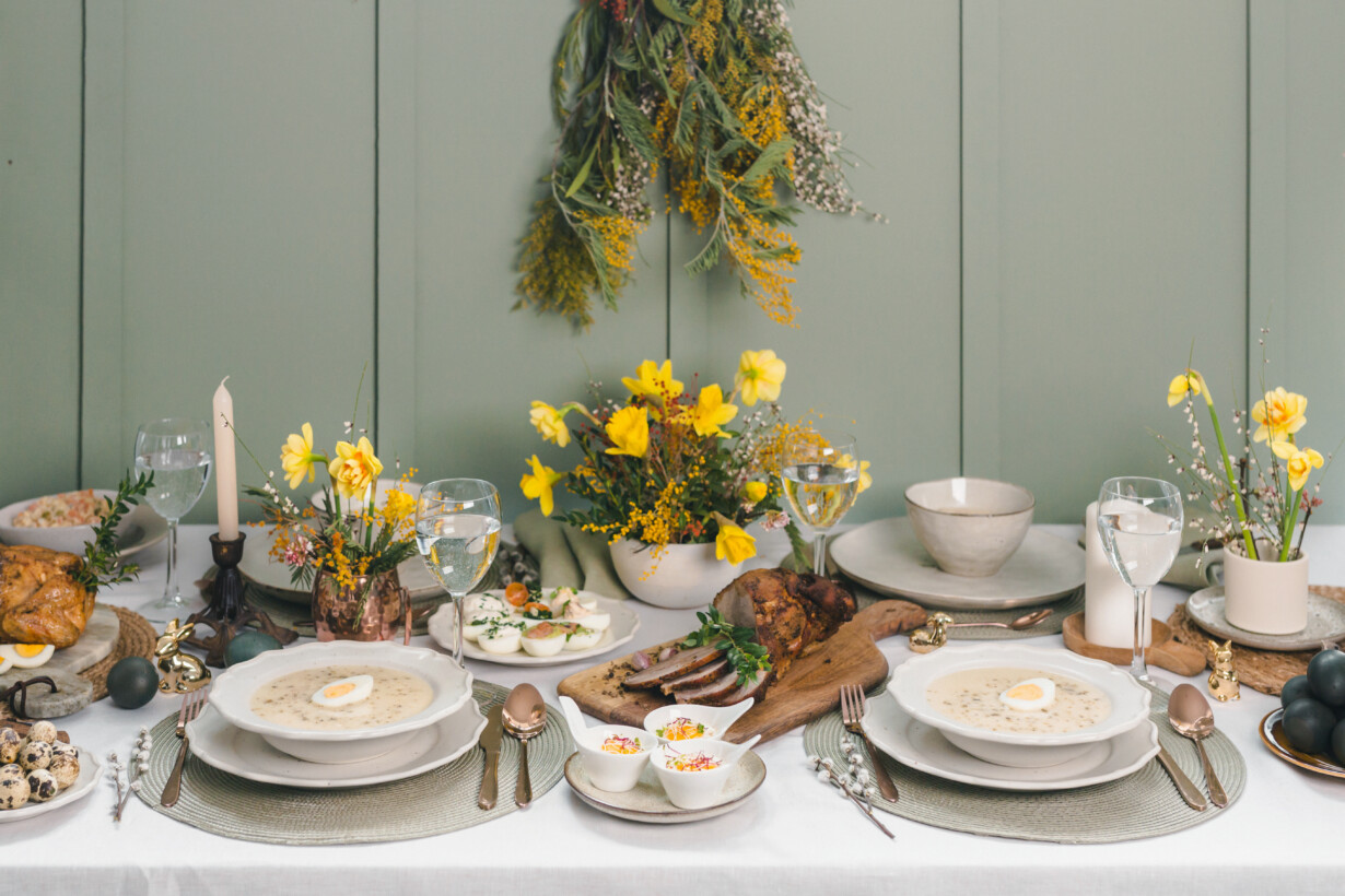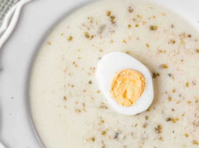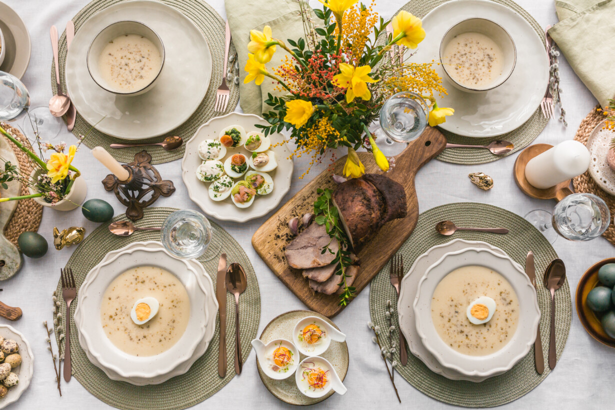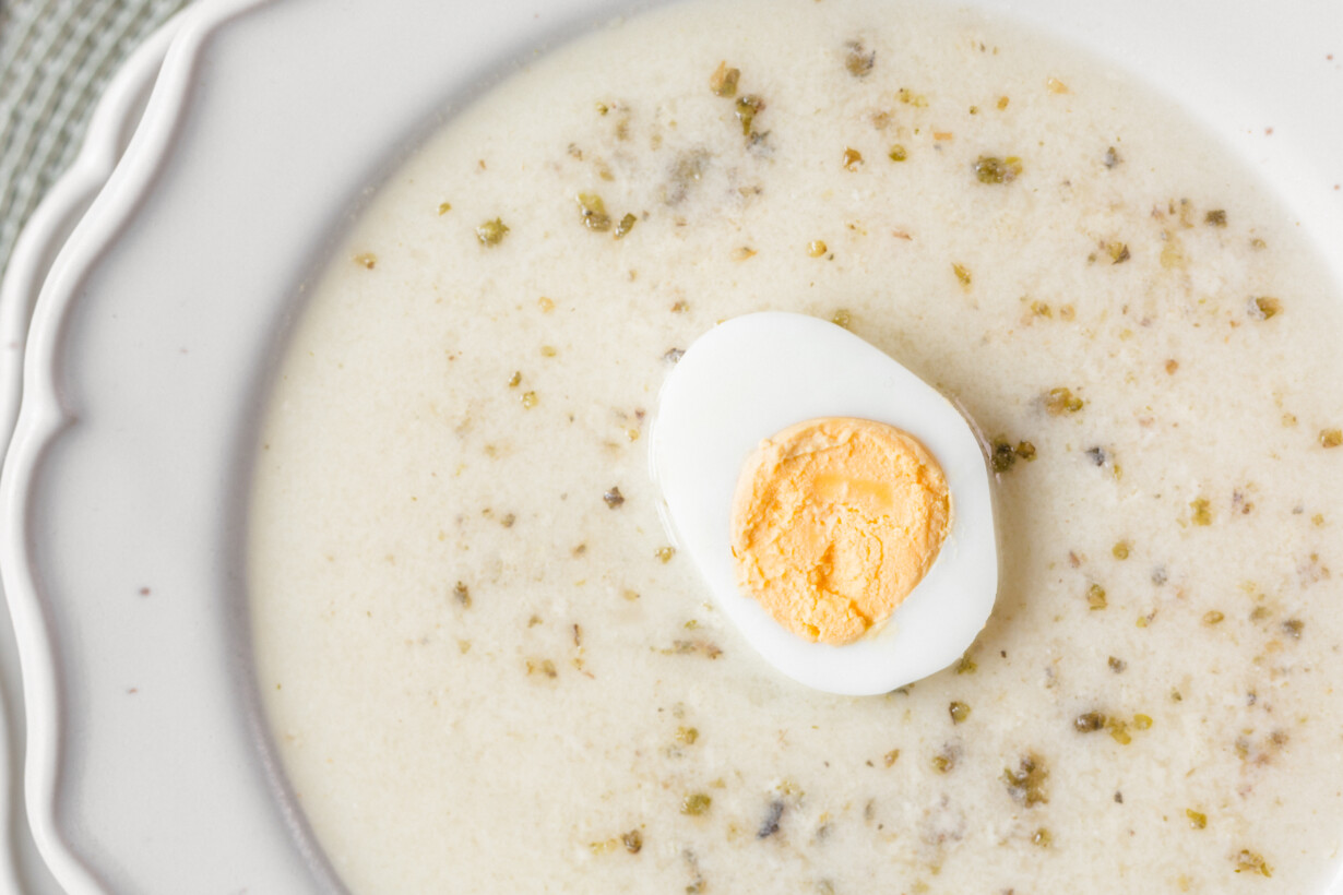 Żur wielkanocny na święconce ( jajka, chrzan, kiełbasa wiejska, boczek, szynka)